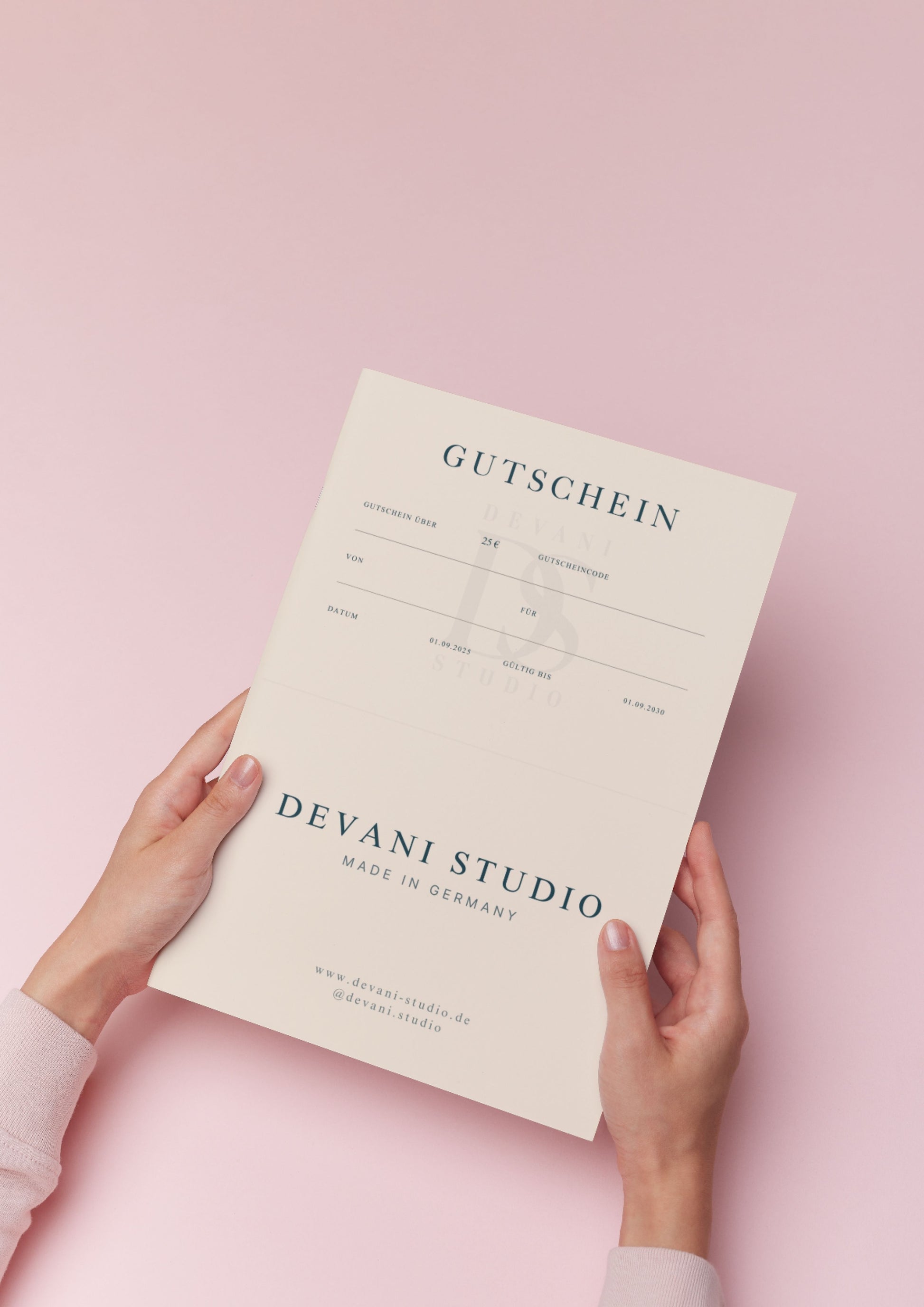 Auf Wunsch erhältst du einen schön gestalteten Gutschein als PDF zum Ausdrucken und Verschenken. Dafür bitte eine kurze E-Mail mit deiner Bestellnummer an kundenservice@devani-studio.de